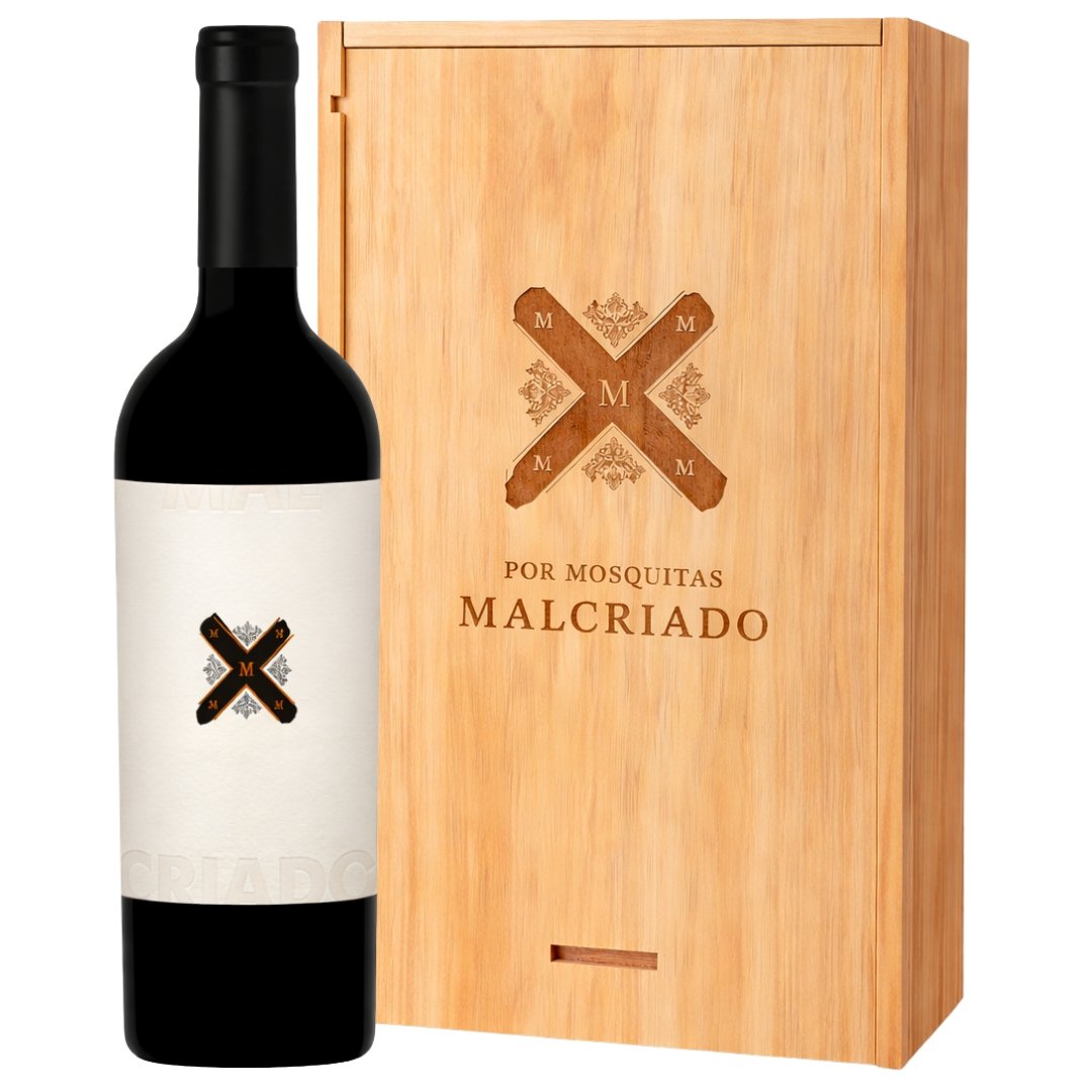 Un estuche de madera con tres botellas de Malcriado Malbec, uno de los vinos más destacados del proyecto Mosquita Muerta Wines.